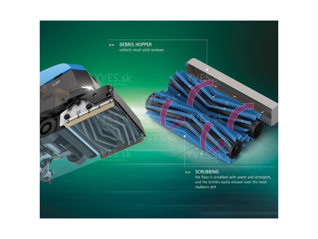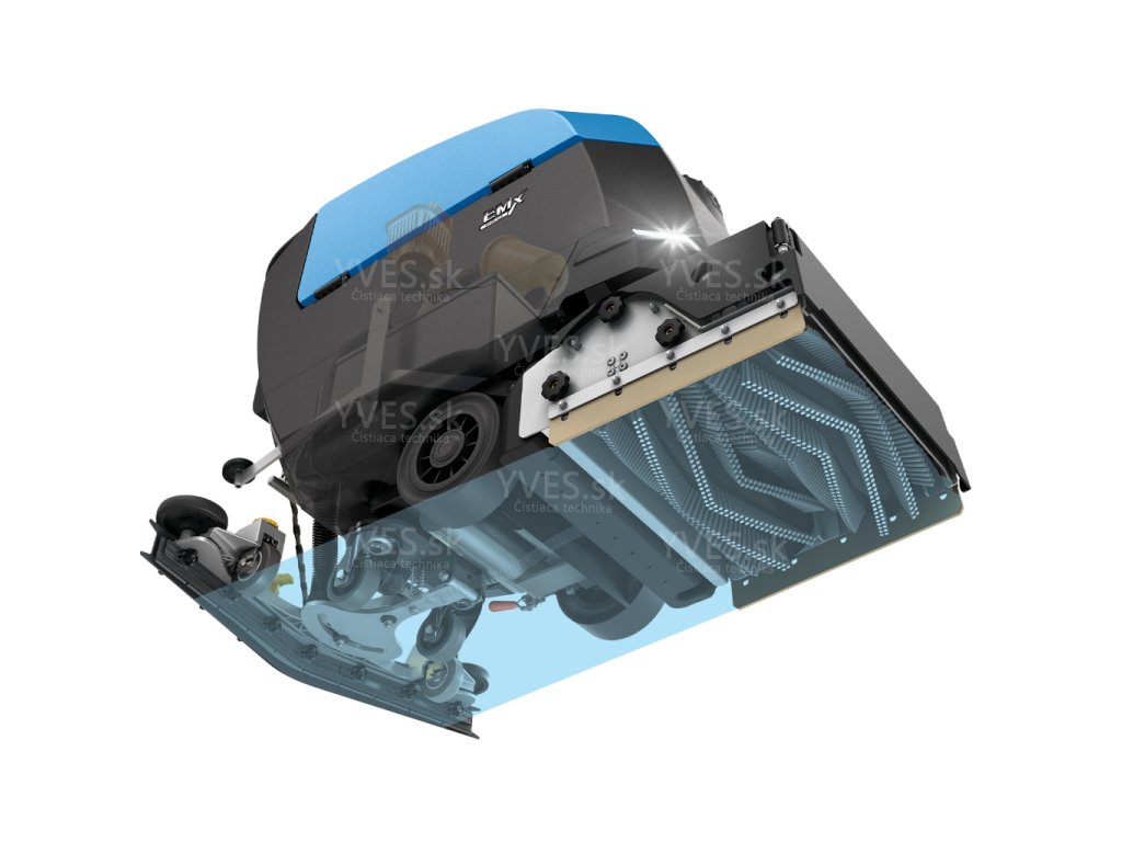 EMx CYLINDRICAL Systém čistenia pozostáva z dvoch protibežných valcových kief, ktoré nielen čistia, ale aj ľahko zametajú. Činnosť zametania odstraňuje malé, pevné zvyšky a zhromažďuje ich v zásuvke inštalovanej za valcovými kefami, ktorá je jednoducho odnímateľná kvôli vyprázdneniu. Tento typ kief sa odporúča na tvrdé podlahy (aj štruktúrované, nerovné alebo nekĺzavé). Štetiny čistia do hĺbky a zaručujú optimálne výsledky aj tam, kde sú veľké medzery. Vzhľadom na vysoký špecifický prítlak a pozoruhodnú rýchlosť otáčania sa hodí skôr na odolné podlahy nechránené polymérovým filmom (voskom). Protibežný pohyb udržuje čistiaci roztok vo vnútri čistiacej plochy, čím sa zvyšuje účinnosť a zároveň je zaručená nízka spotreba vody.