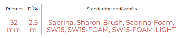 H10-M je štandardná hadica k tepovačom SABRINA, SABRINA SW 15, SHARON BRUSH, SABRINA Foam. Vybavená je nerozbitnými mosadznými spojkami a zabudovanou hadičkou na saponát. Priemer d.32 mm dĺžka 2,5 m.