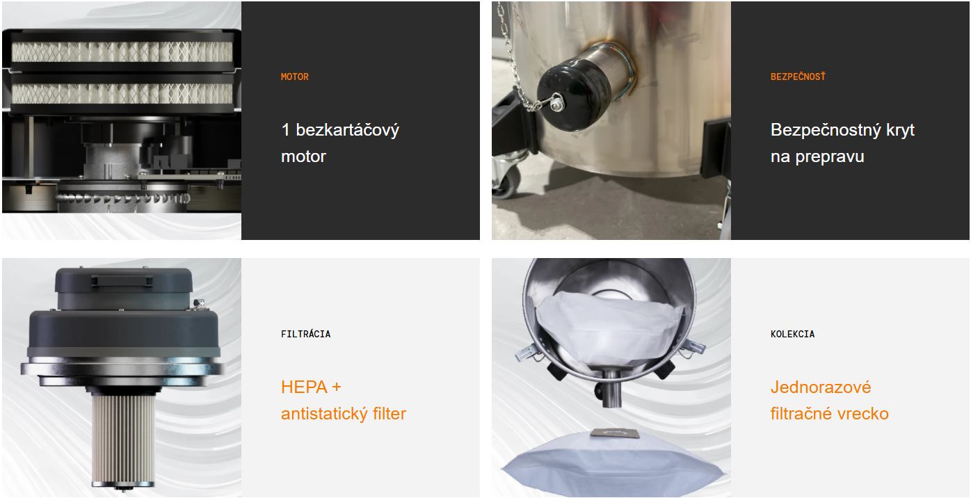 - Filtračný systém na zber prachu využíva filtračné vrecká z mikrovlákien pre maximálnu filtráciu nečistôt