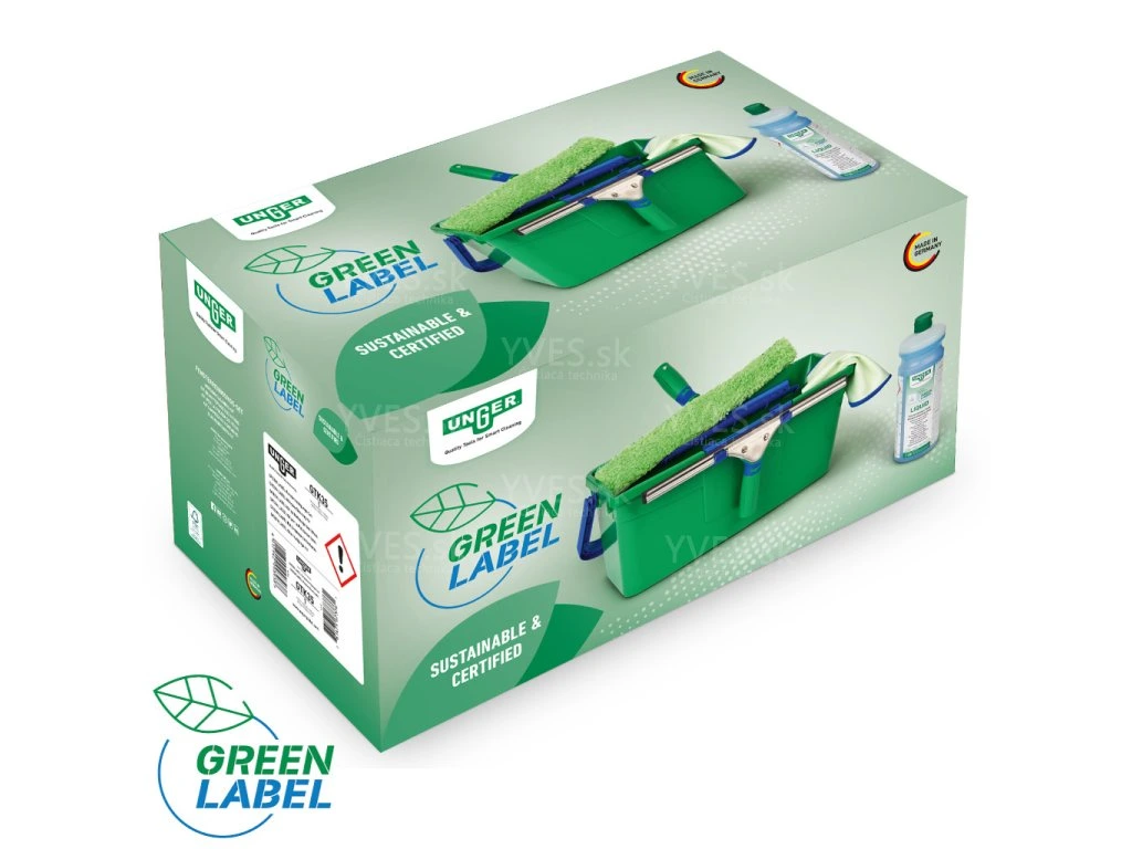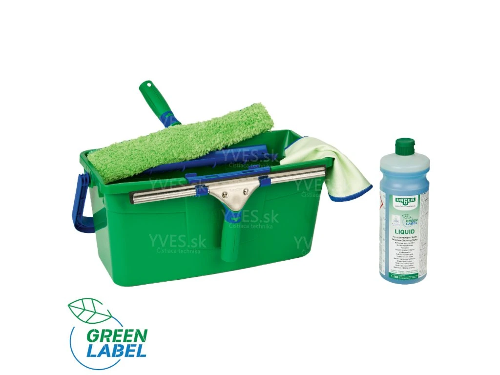 Obsah balenia: 1x Stierka na okná UNGER Green Label 35 cm (GTS35); 1x Rozmývač na okná UNGER Green Label 35 cm kompl (GTT35); 1x Utierka na okná UNGER Green Label Micro 40x40cm (GTMC4); 1x Kýbel UNGER Green Label 12 l (GTB12); Čistiaci prostriedok na okná UNGER Green Label 1l (GTL10)